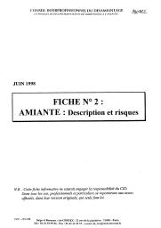 Edition : Conseil interprofessionnel du désamiantage - Techniques de décontamination et de substitution de l'amiante (CID, c/o CERTEX, 22 rue de la Pépinière, 75008 Paris), 1998, non paginé (4 p.), ill., bibliogr.