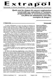 Ce numéro d'Extrapol (Epidémiologie et pollution atmosphérique : analyse critique des publications internationales), rubrique de la revue "Pollution atmosphérique", est consacré aux dangers de l'inhalation par l'homme de fibres minérales. Huit articles récemment publiés ont été sélectionnés, qui font le point sur les aspects "santé" les plus critiques, paraissant aujourd'hui prioritaires, notamment sur les risques de cancers respiratoires (cancer du poumon et du mésothéliome), y compris après des expositions à de faibles doses d'amiante. Pour chacun des articles, un résumé présente les objectifs, méthodes, et résultats de l'étude, et des commentaires sont faits. Mésothéliome pleural : relation dose-réponse à faibles niveaux d'exposition à l'amiante dans une étude cas-témoins au sein d'une population française. Mortalité par cancer du poumon dans une ville italienne et risque pour la pollution attribuable à une usine fabriquant de l'amiante-ciment. Incidence du mésothéliome et exposition environnementale à l'amiante. Analyse des tendances actuelles de l'incidence du mésothéliome aux Etats-Unis. Exposition à l'amiante, asbestose et cancer du poumon attribuable à l'amiante. Mésothéliome pleural malin et exposition environnementale à l'amiante à Casale Monferrato, Italie. Exposition non professionnelle à l'amiante chrysotile et risque de cancer du poumon. Mésothéliome malin : risque attribuable à une exposition à l'amiante.
