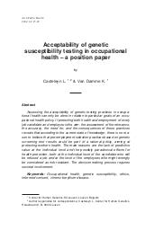L'escalade de la concurrence économique accompagnée de sous-emploi, ainsi que l'introduction des nouvelles technologies constituent un contexte socio-économique qui risque d'encourager l'idée de sélection qui pourrait se traduire par l'exclusion basée sur des tests prédictifs de santé dans plusieurs domaines (médecine prédictive). Des tests génétiques pourraient offrir de nouvelles possibilités entraînant un changement des concepts de normalité, santé et aptitude et de leur perception. Cet article traite des valeurs sociétales et des choix d'objectifs pour la santé au travail, de l'adaptation des stratégies face à des contextes en évolution constante, de la détermination et récusation de nouveaux courants de pensée, des choix entre auto-régulation des entreprises ou législation, approche normalisante et de sélection ou approche préventive et protectrice, concept déterministe ou concept rationnel de prédisposition, rôle marginal ou central pour la médecine du travail, autonomie de décision du travailleur ou contraintes réglementaires, entre législation par les assurances privées ou législation démocratique, enfin de qui doit décider et pour qui, de l'estimation de la conformité aux valeurs sociétales, et de la complémentarité de dispositions législatives et d'un code déontologique.