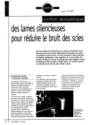 Les lames de scie circulaire à table sont des contributeurs majeurs à l'exposition sonore des employés dans l'industrie du bois. Des essais ont été réalisés sur 13 types de lames différents afin de déterminer leur émission sonore au poste de travail (Lp,A) dans des conditions normalisées et reproductibles. Différents types de technologies sont comparés : deux technologies dites silencieuses (découpe laser et lames sandwich) et des lames sans traitement acoustique particulier. Les résultats montrent des différences de niveaux sonores importants pouvant atteindre 7 dB(A) en charge (configuration défavorable) et 9 dB(A) à vide. Les technologies silencieuses, et en particulier les lames sandwich, s'avèrent effectivement plus performantes ; elles sont opérationnelles et disponibles sur le marché. Il est ainsi démontré que des gains acoustiques élevés peuvent être obtenus en mettant en œuvre des solutions simples (utiliser des lames silencieuses), sans contraintes sur l'organisation du travail et le procédé de fabrication.