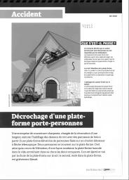 Cette fiche décrit un accident mortel s’étant produit sur un chantier de réhabilitation d’un bâtiment. L’entreprise de couverture-charpente posait des panneaux de bois sous le toit. Ce travail était effectué par 2 salariés à partir d’une plate-forme élévatrice de personnes fixée sur un chariot élévateur à flèche télescopique. Après un mouvement brusque d’élévation, la plate-forme a basculé dans le vide, entraînant dans sa chute les 2 salariés. L’un des 2, éjecté de la plate-forme, a été tué. Cette fiche explique ensuite ce qu’il aurait fallu faire pour éviter cet accident : tenir compte des instructions du fabricant, former les salariés au verrouillage mécanique de la plate-forme sur le tablier du chariot et diriger les manœuvres à partir de la plate-forme et non depuis la cabine du chariot.