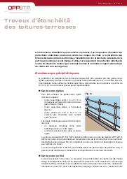 Les étancheurs travaillant le plus souvent en hauteur, il est nécessaire d'installer des protections collectives provisoires contre les risques de chute à la périphérie des toitures-terrasses et dans les trémies. Ce document présente ces protections collectives et explique comment les installer en sécurité. Au sommaire : garde-corps périphériques (garde-corps rigides, garde-corps en filet, montants et support des garde-corps, dispositifs de fixation à la construction, règles d'installation) ; protection des trémies (protection par obturation en utilisant des armatures métalliques, des dispositifs anti-effraction, un platelage ou des filets de sécurité, entretien des protections).