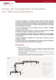 Une grue de chargement est un appareil de levage motorisé à charge suspendue, le plus souvent installé sur un camion de transport de matériels ou de matériaux, à l’avant ou à l’arrière de la benne ou du plateau. La grue de chargement est un appareil très pratique pour les livraisons sur chantier, elle permet de charger et de décharger le camion de façon autonome. La grue de chargement est encore désignée selon son ancienne appellation "grue hydraulique auxiliaire". Les points abordés dans cette fiche sont : description ; spécifications, règles techniques de construction ; caractéristiques générales d’une grue de chargement ; exploitation.