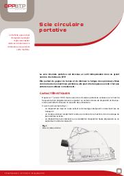 La scie circulaire portative est devenue un outil indispensable dans un grand nombre d'activités du BTP. Elle permet de gagner du temps et de diminuer la fatigue des opérateurs. Mais comme toutes les machines portatives, elle peut être dangereuse si elle n'est pas entretenue et utilisée correctement. Cette fiche a pour objet de rappeler quelques règles essentielles relatives à l'entretien et à l'utilisation en sécurité de cette machine. Les points abordés sont : caractéristiques ; équipement électrique (types de machines, branchement) ; équipement mécanique (lames, protecteur mobile) ; changement et réglage de la lame ; sciage (supports, conduite de la machine, rejet, sciage d'un grand panneau) ; vêtement et protections (tenue de travail, protection auditive, protection respiratoire).