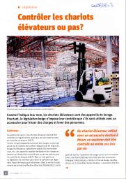 Ce dossier s'intéresse aux chariots élévateurs. En tant qu'appareil de levage, la question de leur contrôle est posée. En Belgique, l'obligation n'existe que s'ils sont utilisés avec un accessoire pour hisser des charges et lever des personnes. Les moteurs de ces équipements de travail sont alimentés par différentes sources d'énergie : essence, diesel, GPL ou batteries. Pour une utilisation à l'intérieur, l'électricité est la meilleure option. L'inconvénient réside dans la phase de rechargement : génération d'une atmosphère explosible, risque chimique lié aux électrolytes. La zone dédiée à la station de charge doit être délimitée et signalée selon la directive ATEX. Les accidents impliquant "les dispositifs de convoyage, de transport et de stockage" dont font partie ces chariots ont été au nombre de 11 569 en 2013, huit mortels ont été comptabilisés. Un tableau donne la répartition des accidents en fonction de l'agent matériel impliqué entre 2009 et 2013.