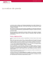 La notice de poste constitue, avec l’étiquetage réglementaire des produits chimiques et la fiche de données de sécurité (FDS), l’un des outils d’information sur la prévention du risque chimique en entreprise. Elle présente les dangers ainsi que les mesures d’organisation et de prévention définis dans le document unique d’évaluation des risques (DUER) de l’entreprise, en fonction de la nature du poste de travail. Elle décrit également le déroulement d’une tâche à effectuer : mode opératoire, consignes, avertissements, équipements de protection collective et individuelle à utiliser, informations sur les secours.