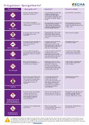 Ce tableau informe sur la signification des pictogrammes et présente les risques associés aux produits en cas de mauvaise manipulation. Il offre également quelques exemples des mesures de sécurité à adopter lors de l'utilisation de ces produits. L’ECHA précise qu’en cas de doute, il est nécessaire de toujours consulter l’étiquette.