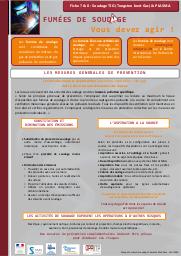 Les fumées de soudage sont constituées de poussières de métaux, du gaz de protection et de gaz polluants de combustion. Les fumées liées aux activités de soudage, de coupage, de brasage et de projection thermique présentent des risques graves pour la santé des opérateurs. Cette fiche présente les mesures générales de prévention à mettre en place lors du soudage TIG et plasma : substitution et diminution des émissions, aspiration à la source, protection collective (ventilation générale mécanique, substitution, aspiration à la source), protections associées, protection individuelle.