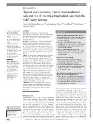 Le but de cette étude était d’examiner les associations entre activités physiques professionnelles (OPA) et de loisirs (LTPA) avec les symptômes d’insomnie et le sommeil non réparateur, ainsi que les associations conjointes entre OPA et LTPA et les insomnies et le sommeil non réparateur, respectivement. Les données proviennent d’une étude transversale incluant 650 salariés de l’étude danoise DPhacto (Danish PHysical ACTivity cohort with Objective measurements). Les OPA et LTPA ont été mesurées par accélérométrie au niveau des cuisses et du haut du dos jusqu'à six jours consécutifs et ensuite divisés en quartiles d'activité « très basse », « basse », « moyenne » et « haute ». Les rapports de cotes (OR) ont été calculés par régression logistiques pour les symptômes d’insomnie et le sommeil non réparateur associés aux OPA et LTPA. Les résultats ont montré qu’une augmentation de 10 % des OPA était associée à une prévalence plus élevée de symptômes d’insomnie mais n'était pas liée au sommeil non réparateur. D’autre part, une augmentation de 10 % des LTPA était associée à une prévalence plus faible du sommeil non réparateur. Bien qu’on n’ait pas trouvé d’interaction additive significative, les analyses de l’association conjointe des OPA et LTPA ont montré que les sujets avec des OPA élevées et des LTPA faibles avaient un OR à 2,07 pour les symptômes d’insomnie, par rapport à ceux avec de faibles OPA et des LTPA élevées, alors que les sujets qui avaient des niveaux élevés dans les deux cas avaient un OR de 1,47. En conclusion, alors que les LTPA sont associées à une faible prévalence de problèmes de sommeil, les OPA le sont à une prévalence élevée de symptômes d’insomnie. Une combinaison de OPA élevées et LTPA faibles était plus fortement associée aux symptômes d’insomnie qu’une combinaison de faibles OPA et LTPA élevées.