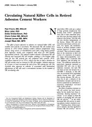 Cet article étudie les effets d'une exposition à l'amiante ciment sur l'activité et le nombre des cellules tueuses naturelles (NK). Les résulats de l'étude montrent que l'exposition à l'amiante est associée à une diminution de l'activité des NK et à une augmentation du nombre de ces cellules.
