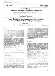 Approche éducative et réadaptative de la lombalgie non spécifique et de la lombalgie chronique : cette approche est proposée en fonction de la durée du tableau clinique et du handicap associé à la lombalgie, au stade aigu un repos relatif de courte durée associé à une information médicale et à l'utilisation d'antalgiques périphériques ou d'anti-inflammatoires non stéroïdiens, au stade subaigu une réactivation précoce avec réinsertion rapide en milieu de travail, et au stade chronique une approche multidisciplinaire de réadaptation est souvent nécessaire. Rôle du médecin du travail en matière de reprise du travail : cet article décrit la mission du médecin du travail en matière de reprise du travail après une absence de 4 semaines au moins pour des raisons de santé, et dans ce cas particulier pour lombalgie (nature des examens médicaux, examens de reprise du travail, communication de la décision). Réflexions sur le contexte psychosocial et le vécu du patient lombalgique, le point de vue d'un médecin-conseil de mutuelle : l'article évoque de façon imagée la difficulté pour le médecin conseil de mutuelle (assurance maladie) d'évaluer l'incapacité de travail du patient lombalgique, difficulté qui est non seulement liée au contexte psychosocial du patient mais aussi à la personnalité du médecin appelé à prendre une décision résultant d'une démarche scientifique dans un cadre réglementaire.