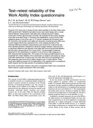 Le but de cette étude était d'évaluer la reproductibilité d'un questionnaire destiné à évaluer la capacité de travail (le Work Ability Index - WAI), mis au point au début des années 80 par le FIOH (Finnish Institute of Occupational Health). La reproductibilité du WAI a été évaluée par deux séries de mesures à 4 semaines d'intervalle, chez 97 anciens employés de la construction âgés de 40 ans et plus. L'analyse s'appuyait sur la reproductibilité des scores eux-mêmes, ainsi que sur la classification dans l'une des quatre catégories du WAI basées sur les scores : faible, modérée, bonne et excellente. Les mêmes scores sur les deux types de mesures ont été rapportés chez 25 % des sujets, et 95 % des différences individuelles entre les mesures étaient inférieures à 6,86 points (deux fois la déviation standard). Malgré ces différences individuelles, il n'a pas été démontré de différence significative dans le score WAI moyen au niveau du groupe entre les deux sessions (40,4 contre 39,9). Les résultats de l'étude font la preuve d'une reproductibilité acceptable de la classification de l'aptitude au travail des sujets au moyen du WAI. Au niveau du groupe, les scores moyens et la classification dans les diverses catégories se sont avérés stables après un intervalle de 4 semaines. Ces résultats vont dans le sens d'une applicabilité de ce questionnaire dans le domaine de la recherche en santé au travail comme dans la pratique courante de médecine du travail.