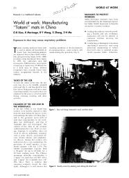 Les troubles musculosquelettiques (TMS) et leurs facteurs de risque dans la production mécanique ont été examinés à l'aide d'entretiens, d'analyses des postures, et de l'équation révisée du NIOSH (National Institute for Occupational Health) pour le lever de charges. 69 travailleurs affectés dans des tâches de manutention manuelle (emploi A) et 51 travaillant sur les machines (emploi B) et ayant moins de manutentions à effectuer ont été étudiés. Les taux de prévalence des lombalgies (au moins un épisode durant 24 heures ou plus au cours des 12 derniers mois) étaient respectivement de 63.8 % et 37.3 % pour les emplois A et B. Les taux de prévalence des lombalgies survenant chaque jour pendant une semaine ou plus attribuées au lever de charges étaient respectivement de 26.09 % et de 5.88 % pour les emplois A et B. L'analyse de régression multiple a révélé que la répétitivité des levers de charges et l'âge contribuaient à la survenue des lombalgies. La "charge composite" (poids de la charge par la répétitivité) avait un effet néfaste significatif sur les lombalgies.