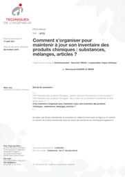 Cette fiche définit l’organisation nécessaire pour maintenir à jour un inventaire de produits chimiques en entreprise. L’actualisation continue de son inventaire permet d’impliquer les acteurs concernés par le risque chimique, et d’éviter les situations suivantes : perte de données, données obsolètes, dangers et risques ou nouvelles obligations non identifiés.