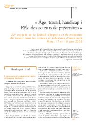 Age, travail, handicap ? Rôle des acteurs de prévention. 23e congrès de la Société d'hygiène et de médecine du travail dans les armées et industries d'armement. (Metz, 17 et 18 juin 2009).
