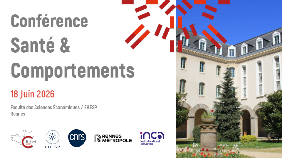 | Santé & Comportements : conférence interdisciplinaire 18 juin 2026 à Rennes Organisée par la Chaire d’économie et management des établissements de santé (EHESP), la Chaire économie de la santé glocale (Rennes Métropole-CNRS) et la Chaire alcool SHS (INCa), cette conférence dédiée à la santé et aux comportements en milieu de soins s'intéressera à deux axes : Santé et comportements des soignants et des patients en milieu de soins et Santé et comportements de la population et du citoyen, avec un focus en économie, psychologie et management. RDV le 18 juin 2026 à la Faculté des Sciences économiques de l’EHESP de Rennes. En savoir plus |