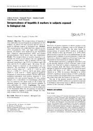 Etude de la séroprévalence du VHC (virus de l'hépatite C) chez 809 personnes (personnels de laboratoire, biologistes, microbiologistes, anatomopathologistes, médecins, chirurgiens, obstétriciens, soignants, etc.) régulièrement en contact avec des produits d'origine biologique tels que des fluides ou tissus biologiques, et chez 408 sujets témoins. Le groupe exposé a été subdivisé en 3 sous-groupes, en fonction du niveau de risque biologique (faible ou occasionnel (262), moyen mais permanent (311) et élevé (236)). La séroprévalence du VHC est faible chez tous les sujets de l'étude (1,40 %). Il n'y a pas de différences significatives observées entre les groupes ; on relève par exemple pour le sous-groupe le plus à risque une séroprévalence de 1,27 %.
