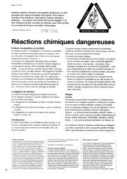 Cet article présente de manière synthétique des informations relatives aux réactions chimiques dangereuses : comment elles se produisent, les 3 catégories de ces réactions et des exemples de ces dernières, les risques possibles, comment les éviter lors du stockage et de la manipulation de produits chimiques. Les 3 catégories sont les réactions exothermiques, les réactions avec dégagement de substances dangereuses, les réactions avec dégagement simultané de chaleur et de substances dangereuses. Les risques sont l'incendie, l'explosion, l'intoxication, les brûlures chimiques et la pollution de l'environnement. Un encart présente des accidents récents produits en Belgique ainsi que les types d'accidents les plus fréquents dans une usine d'épuration (intoxication au sulfure d'hydrogène, H2S).