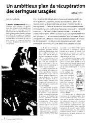 L'article met en avant les travaux d'un groupe de travail sur la récupération des seringues usagées au Québec. Formé de spécialistes en santé publique, le groupe a livré fin 2004 un ambitieux plan de récupération des seringues et des aiguilles usagées qui fait appel à tous les québécois. Grâce au travail de mobilisation d'un réseau de responsables régionaux, différentes mesures sont entrées en vigueur : distribution gratuite de contenants de sécurité à toute personne faisant un usage domestique de seringues ou d'aiguilles, mise à disposition des contenants de sécurité dans divers endroits publics (gares, hôtels, centres commerciaux, etc.), information de tous les travailleurs susceptibles de trouver des seringues usagées dans leurs milieux respectifs, sensibilisation des utilisateurs professionnels (médecins, dentistes, vétérinaires, etc.), élaboration de mesures de prévention et d'outils de sensibilisation destinés aux travailleurs concernés par la récupération, l'entreposage et le transport des seringues et aiguilles usagées, mise en place de services de soutien et de suivi des victimes de piqûres accidentelles.