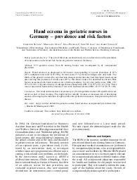 Les auteurs ont étudié, d'une part, la prévalence des eczémas aux mains, des lombalgies et des douleurs au cou et aux épaules chez des infirmières de services gériatriques, et d'autre part, l'association de ces symptômes avec des facteurs professionnels. Plus de 1300 infirmières et aides-soignantes ont été inclues dans l'étude. Des examens cliniques et des interviews ont été menés. Les résultats indiquaient une forte prévalence des eczémas aux mains (18 % des personnes), des lombalgies (47,9 % des personnes) et des douleurs au cou et aux épaules (16,6 % des personnes). Les facteurs de risque les plus significatifs étaient pour les eczémas, un eczéma atopique dans l'enfance et une peau sèche ou qui démange. Pour les lombalgies et les douleurs au cou et aux épaules, les facteurs de risque étaient l'âge et l'ancienneté dans la profession, des lombalgies soignées précédemment et un stress psychologique. Les auteurs recommandaient de mettre en place des mesures améliorant la santé de ces infirmières.