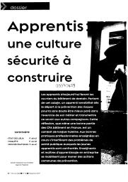 Ce dossier est consacré à la culture de sécurité du travail chez les apprentis du secteur du bâtiment. Cette culture est importante pour qu'ils sachent faire face aux risques professionnels au cours de leur apprentissage et au cours de leur future vie professionnelle. Les actions menées dans ce domaine par l'OPPBTP et des CFA bâtiment (centres de formations des apprentis du secteur du BTP) sont présentées. Par exemple, une convention a été signées entre le CCCA-BTP et l'OPPBTP en 2003. Les objectifs étaient d'améliorer la formation dispensée aux apprentis dans le domaine de la santé et de la sécurité au travail, de réaliser des outils pédagogiques et d'adapter le matériel et les pratiques dans les CFA. Des fiches d'accueil récapitulant les risques dans 8 métiers ont été réalisées par l'OPPBTP et le CFA bâtiment de Limoges. Un article présente également les comportements à risque chez les apprentis (consommation d'alcool et de drogues).