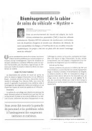 Les ambulanciers peuvent subir de nombreuses contraintes à bord de leurs véhicules. Lors de situations d'urgence et soumis aux vibrations du véhicule, ils sont susceptibles à la fatigue, à l'inefficacité et aux troubles musculo-squelettiques. Cet article décrit un projet d'aménagement de leur véhicule. Les auteurs ont d'abord réalisé un inventaire des différents problèmes reliés à l'aménagement des rangements intérieurs et extérieurs pendant l'inventaire, l'arrivée sur les lieux, l'intervention dans le module et le nettoyage. Cet inventaire a permis d'apporter des solutions en concevant un nouvel aménagement davantage en accord avec les protocoles de soins, les normes et la gestuelle du personnel au travail. Ce concept a permis d'optimiser l'environnement immédiat du poste de travail, notamment les zones d'atteinte aux équipements et de réduire les contraintes physiques reliées à l'execution des différentes tâches.