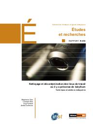 L’objectif de ce travail était d’estimer l’efficacité de lingettes humides dans l’élimination du béryllium, avec différentes solutions incluant : Citranox (solution d’acide citrique), Alconox (solution de dodécylbenzènesulfonate, carbonate de sodium, pyrophosphate de sodium et phosphate de sodium), NaCl à 5 %, eau du robinet, Resolve (solution de propylèneglycol n-butyl éther, dipropylèneglycol méthyl éther, phosphate trisodique et d’alcools éthoxylés en C12-C15), et Ledizolv (détergent liquide anionique), sur des surfaces de types variés comme du métal peint ou non peint, des châssis cadres en bois, du béton peint ou non, et du Plexiglas, dans trois situations professionnelles différentes. Trois installations industrielles ont été examinées : une fonderie d’aluminium, le département d’outillage et de fraisage d’une usine produisant des bouteilles en plastique extrudé et un grand atelier d’usinage, en cours de décontamination, qui produisait antérieurement des pièces métalliques pour des industries militaire, aérospatiale et de télécommunications. Le protocole de décontamination comprenait le nettoyage en trois phases consécutives à l’aide de lingettes trempées dans la solution étudiée. Seules les surfaces de la fonderie d’aluminium étaient décontaminées en-dessous du niveau de clairance recommandée de 0,2 microg/100 cm2, avec tous les solvants utilisés. Dans le département des machines outils et fraisage, le niveau de 0,2 microg/100 cm2 était atteint après les trois décontaminations, avec tous les solvants. Dans l’atelier d’usinage, les concentrations de béryllium sur les murs en béton, avant la décontamination faite avec le nettoyeur à haute pression, étaient supérieures à 3 microg/100 cm2, et des concentrations de 31 microg/100 cm2 avaient été relevées. Après le nettoyage à haute pression, les concentrations en béryllium étaient parfois réduites d’un facteur 10, mais jamais le niveau de clairance n’était atteint. Les composés de béryllium qui avaient adhéré à la plupart des types de structures qui ont subi les essais de décontamination étaient réduits à un niveau inférieur à celui de la clairance de référence, excepté sur les sols en béton. En outre, cette étude n’a pas révélé de différences entre les actions de décontamination par tous les solvants utilisés.