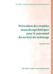 Ce document est destiné au personnel de nettoyage. Il propose des mesures de prévention concrètes concernant les troubles musculosquelettiques (TMS). Pour les auteurs, les TMS comprennent les affections des membres supérieurs et inférieurs et les maux de dos. Les mesures de prévention proposées concernent le nettoyage du sol et des vitres, la manutention d'objets, etc. Les préconisations sont les suivantes : travailler à bonne hauteur, prévoir un accès facile au poste de travail, utiliser des aides techniques (chariots, balais) pour réduire les efforts et les répétitions, améliorer les rangements et les conditions de circulation, éviter ou réduire les vibrations (cas de l’utilisation de polisseuses). Une organisation différente du travail, de bonnes postures de travail et des exercices d’étirement sont également proposés. Ce document est disponible en pdf sur le site du SPF : www.emploi.belgique.be.