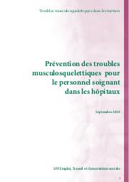 Ce document est destiné au personnel soignant dans les hôpitaux. Il propose des mesures de prévention concrètes concernant les troubles musculosquelettiques (TMS). Pour les auteurs, les TMS comprennent les affections des membres supérieurs et inférieurs et les maux de dos. Les principales préconisations sont les suivantes : travailler à la bonne hauteur, prévoir un accès facile au poste de travail, améliorer les conditions de circulation, utiliser de bonnes postures de travail et/ou utiliser des aides techniques pour faciliter le déplacement des patients (aide pour lever un patient, transfert depuis un lit, etc.) et des charges. Une organisation différente du travail, de bonnes postures de travail et des exercices d’étirement sont proposés. Ce document est disponible en pdf sur le site du SPF : www.emploi.belgique.be.