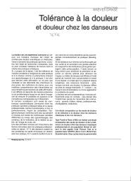 Cet article fait une revue de la littérature sur la douleur chez les danseurs professionnels. La douleur a été jusqu’ici plus étudiée chez les sportifs que chez les danseurs. L’article montre que les danseurs classiques sont plus sensibles à la douleur que les non-danseurs (seuil de douleur plus élevé), mais qu’ils ont des seuils de tolérance plus élevés. De futures recherches sont nécessaires pour notamment mieux prendre en compte la douleur dès l’apprentissage et proposer des mesures de prévention.