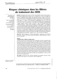 Conséquence des cycles de vie des consommables de plus en plus courts et d'un contexte réglementaire de plus en plus contraignant, le secteur du recyclage des déchets a largement évolué depuis une quinzaine d'années. Dans les filières de traitement des déchets d'équipements électriques et électroniques (DEEE), de nombreux risques sont présent et notamment le risque chimique qui est particulièrement préoccupant. Le manque d'éco-conception, l'augmentation des flux ainsi que l'organisation des postes de travail et des procédés de traitement de ces équipements en fin de vie sont, en grande partie, responsables des expositions professionnelles (plomb, cadmium, baryum, yttrium et mercure) dans les principales filières de traitement primaires (écrans à tubes cathodiques et lampes usagées) et secondaires (cartes électroniques, câbles électriques et plastique). L'évaluation du risque chimique par filière et par procédé de traitement présentée dans cet article a permis de réaliser un état des lieux du secteur d'activité, d'identifier les opérations les plus polluantes et de hiérarchiser les actions de prévention à mettre en oeuvre pour réduire le risque chimique à la source. Les propositions d'ingénierie de prévention relatives à l'amélioration des installations existantes testées en laboratoire et sur site contribueront à la réduction du risque chimique dans ces filières de traitement des DEEE et favoriseront la conception et le développement de procédés « propres et sûrs » dans les filières émergentes.