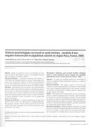 Cette étude visait à explorer l'association entre intimidation au travail et usage de médicaments psychotropes et à examiner le rôle de médiateur de la santé physique et mentale. La population étudiée se composait d'un échantillon aléatoire de la population active du sud-est de la France (3132 hommes et 4562 femmes). L'intimidation au travail, évaluée à l'aide de l'instrument élaboré par Leymann, et la consommation de psychotropes, ainsi que les co-variables ont été mesurées à l'aide d'un questionnaire auto-administré. Les co-variables comprenaient l'âge, l'état matrimonial, la présence d'enfants, l'éducation, la profession, les horaires de travail, le travail de nuit, les expositions physico-chimiques au travail, l'auto-évaluation de la santé et les symptômes dépressifs. L'analyse statistique a été effectuée séparément pour les hommes et les femmes. L'intimidation au travail est fortement associée à la consommation de psychotropes. Une exposition passée à l'intimidation en augmente le risque. Plus l’exposition est fréquente et plus elle est prolongée, plus l'association avec la consommation de psychotropes est forte. Etre témoin d’actes d'intimidation au travail est associé à la consommation de psychotropes. L’ajustement pour les co-variables ne modifie pas les résultats. Des ajustements supplémentaires pour l'auto-évaluation de la santé et les symptômes dépressifs réduisent l'importance de l’association, particulièrement pour les hommes. En conclusion, l'association entre intimidation et consommation de psychotropes est jugée importante et forte ; elle est partiellement modulée par la santé physique et mentale.