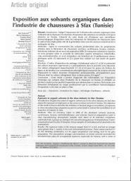 A Sfax, deuxième ville de la Tunisie, l’industrie de la fabrication de chaussures entraîne une grande consommation des colles, des diluants et des décapants à bases de solvants organiques (SO). L’objectif de cette étude a été de repérer les entreprises de fabrication de chaussures en cuir par procédé soudé et de mieux connaître les techniques de fabrication utilisées et les expositions qui en découlent afin de pouvoir, dans un deuxième temps, évaluer les risques chimiques induits par les SO et mieux connaître les procédés de fabrication et les expositions utilisés dans les entreprises de fabrication de chaussures en cuir par procédé soudé, permettant d’évaluer les risques chimiques induits par ces solvants. Durant le premier semestre de 2005, les auteurs ont repéré 103 entreprises de fabrication de chaussures en cuir et ses dérivés, moyennant des listes de la chambre régionale du commerce, de l’industrie et de l’artisanat, et du centre régional des cuirs et chaussures de Sfax. Ces listes ont été complétées par le porte-à-porte dans les quatre zones industrielles et la Médina (vieille ville) afin de préciser le procédé de fabrication (industriel, semi-industriel ou artisanal), de dresser un inventaire qualitatif et quantitatif des substances manipulées, de définir les différents types de populations concernées en fonction de leurs activités et l’exposition aux solvants et/ou aux colles et de décrire l’ambiance générale de travail et la qualité de la ventilation dans ces entreprises. Seules 92 entreprises ont accepté une participation finale : 26 industrielles, 6 semi-industrielles et 60 artisanales. Les solvants et les colles les plus manipulés ont été les cétones, les solvants halogénés, les durcisseurs, les diluants et les colles polyuréthanes et néoprènes. Quel que soit le procédé de fabrication 84,5 % des salariés ont été exposés aux solvants et/ou aux colles. Les procédés artisanal et semi-industriel occupent les zones d’habitation avec respectivement 96,7 % (exclusivement dans la Médina) et 83,3 %. Les surfaces des entreprises à procédé artisanal ont été les plus réduites avec une moyenne de 86 m2 dont 22 entreprises avec des surfaces de moins de 25 m2. L’aération naturelle reste le principal moyen de ventilation des locaux quel que soit le procédé de fabrication. La proposition des équipements de protection individuelle aux salariés reste insuffisante quel que soit le procédé industriel. La principale difficulté rencontrée a été le repérage des entreprises à procédé semi-industriel et artisanal. Les entreprises semi-industrielles sont de type artisanal ; elles fonctionnent à grande échelle avec une certaine mécanisation, où la majorité de leurs employés sont payés au nombre de pièces produites par jour. Les entreprises à procédé artisanal suivi du semi-industriel semblent presenter le plus de risques chimiques, ce qui sera vérifié moyennant une modélisation de l’évaluation du risque chimique.