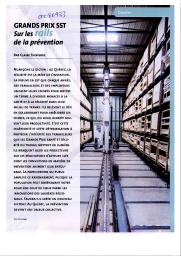 Ce dossier présente les gagnants des grands prix santé et sécurité du travail du Québec. Ils sont composés de deux catégories : innovation et leader en santé et sécurité du travail. La catégorie innovation récompense des réalisations, des projets tangibles ou des démarches proactives en santé et sécurité qui ont résolu d’une manière ingénieuse un problème de santé et de sécurité du travail : automatisation d’un système de distribution aux quais de chargement, dépoussiéreur à bois fabriqué à partir de pièces recyclées, automate programmable et sur rail qui permet de récupérer des moulures, chariots permettant de limiter les manutentions manuelles, système d’injection d’eau et d’air pour éviter les risques de dispersion des poussières de farine, taille-haie motorisé, etc. La catégorie leader honore une personne s’étant particulièrement distinguée dans leur milieu de travail pour avoir transmis à leurs collègues la valeur de la santé et la sécurité du travail.