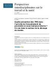 Cet article vise à documenter, à partir d’un cas, la façon dont un encadrant de proximité exerçant en sous-traitance interne dans le secteur de la découpe de viande peut participer à la conception d’une organisation du travail favorable à la prévention des TMS des opérateurs encadrés. Le recueil de données porte sur le travail de régulation de l’encadrant de proximité et ses déterminants. La méthodologie mobilise principalement des entretiens, des observations et des autoconfrontations. Les résultats montrent que l’encadrant de proximité parvient, dans un contexte contraint et par des régulations opératives, à desserrer certaines contraintes de l’organisation du travail des opérateurs encadrés. Ces régulations portent sur la répartition des personnes en activité et la participation de l’encadrant aux activités de découpe de viande. Dans le contexte de sous-traitance, ces régulations, mises en exergue essentiellement du côté des logiques de performance, participent indirectement à des logiques de préservation de la santé difficilement visibles a priori.