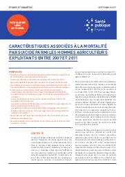 Des études, en France comme à l’international, montrent un excès de risque de décès par suicide chez les travailleurs du monde agricole. Toutefois, peu d’études se sont intéressées aux disparités existant parmi les agriculteurs exploitants et pouvant être associées à une surmortalité par suicide. Cette étude, portant chez les hommes agriculteurs exploitants entre 2007 et 2011, en France métropolitaine, met en évidence des différences de mortalité par suicide en fonction de leurs caractéristiques socioprofessionnelles qui sont d’avoir : un âge compris entre 45 et 54 ans par rapport à ceux âgés de moins de 35 ans ; une exploitation à titre individuel par rapport au fait d’avoir une exploitation à titre sociétaire ; une activité d’exploitant à titre exclusif par rapport au fait d’avoir une activité d’exploitant à titre non exclusif ; une surface agricole utile (SAU) comprise entre 20 et 49 hectares par rapport au fait d’avoir une SAU de plus de 200 hectares ; une exploitation située en Auvergne-Rhône-Alpes, Bourgogne-Franche-Comté, Bretagne et dans les Hauts-de-France par rapport au fait d’avoir une exploitation située dans le Grand Est. Ces premiers résultats doivent permettre d’orienter des actions de prévention du suicide dans le monde agricole. Ces analyses doivent être reconduites dans les prochaines années afin de consolider ces premiers résultats.