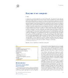 Le baryum est un métal lourd divalent, très réactif et inflammable ; des particules finement dispersées forment des mélanges explosifs dans l'air. Dans la nature, il existe essentiellement sous forme de barytine (BaSO4) et de withérite (BaCO3). Le baryum et ses composés ont de nombreuses applications, notamment dans l'industrie pétrolière, l'industrie chimique et le secteur des matières de charge. Les intoxications sont généralement aiguës et dues à l'ingestion accidentelle ou volontaire de certains composés. Leur capacité à libérer des ions Ba++ dans les fluides biologiques est un déterminant critique de leur toxicité. Les composés solubles tels que l'oxyde, le nitrate et le chlorure sont donc plus toxiques que les composés insolubles. Bien que BaCO3 ne soit pas soluble dans l'eau, en cas d'ingestion, des ions Ba2+ sont libérés dans l'estomac suite à sa solubilisation en milieu acide. Le sulfate, le chromate et le fluorure sont peu solubles dans l'eau. Le tableau clinique comporte nausées, vomissements, violentes douleurs abdominales accompagnées de diarrhées, de myoclonies, contractures douloureuses puis paralysie flasque, de troubles du rythme et de la conduction cardiaque. La mort survient généralement suite à un arrêt cardiorespiratoire. Le traitement est symptomatique. Les mécanismes d'action toxique du baryum ne sont pas totalement élucidés mais semblent essentiellement liés à une hypokaliémie de transfert et à la stimulation des fibres musculaires lisses, striées et cardiaques provoquées par les ions Ba2+. Chez l'animal, le système cardiovasculaire et le système nerveux sont les principales cibles en cas d'exposition aiguë (BaCl2). Ni les études expérimentales, ni les études épidémiologiques n'objectivent de façon consistante un effet de l'exposition prolongée sur la morbidité/mortalité cardiovasculaire. La néphrotoxicité, effet critique chez le rat exposé de façon chronique (BaCl2), n'est pas rapportée chez l'homme. L'inhalation prolongée de poussières de BaSO4 est susceptible d'entraîner une pneumoconiose bénigne, ou barytose. Sur la base des connaissances actuelles, le baryum n'est pas classé comme agent cancérogène, mutagène ou reprotoxique.