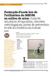 Le mélange équimolaire d’oxygène et de protoxyde d’azote (MEOPA) est de plus en plus utilisé en milieu de soins, en structure ou hors structure hospitalière. A ce jour, aucune valeur limite d’exposition professionnelle (VLEP) n’est disponible en France pour le protoxyde d’azote (N2O). Pourtant, compte tenu des données disponibles sur les effets sur la santé du N2O, il semble essentiel de limiter les expositions. Cette communication présente les résultats des campagnes de prélèvements atmosphériques de N2O les plus récentes réalisées en milieu de soins. Il s'agit du résumé d'une communication sur le thème : de la métrologie des expositions à l'évaluation des risques chimiques.