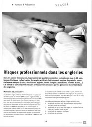 Dans les salons de manucure, les techniciens sont quotidiennement en contact avec plus de 20 substances chimiques. La fabrication des ongles artificiels fait intervenir nombre de produits potentiellement toxiques (colles, durcisse...