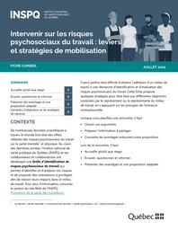 De nombreuses recherches scientifiques à travers le monde font état des effets nocifs des risques psychosociaux du travail sur la santé mentale et physique. Au cours des dernières années, l’INSPQ et ses collaborateurs ont développé une Grille d’identification de risques psychosociaux du travail (document présent dans INRS-Biblio : ref. 165471) qui permet de repérer ces risques et de proposer des orientations à privilégier dans le milieu de travail. Il peut parfois être difficile d’obtenir l’adhésion d’un milieu de travail à une démarche d’identification et d’évaluation des risques psychosociaux du travail. Cette fiche propose quelques stratégies pour faire face aux différentes objections soulevées par le représentant du milieu de travail, en s’appuyant sur les principes de l’entrevue motivationnelle. Lorsqu'on planifie une rencontre, il faut choisir les arguments, préparer l’information à partager et connaître les avantages entourant la proposition. Lors de la rencontre, il faut accueillir plutôt que réagir, écouter, questionner et informer ainsi que présenter des avantages et une proposition adaptée.