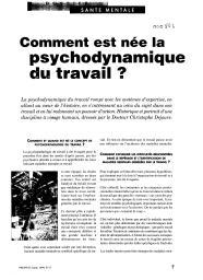 La première partie de ce dossier présente la psychodynamique du travail dans son historique et sa méthodologie ainsi que les approches transactionnelles et causalistes permettant d'étudier la problématique de la santé mentale : comment est née la psychodynamique du travail, différentes approches de l'organisation du travail et santé mentale, historique de la psychopathologie et de la psychodynamique du travail dans les services médicaux d'EDF et GDF (1988-1999), le stress et l'ornithorynque, l'accueil clientèle (présentation de la démarche et du document). La seconde partie est consacrée aux actions de terrain en santé mentale au travail : quand les personnes souffrent c'est le travail que j'interroge (interview du docteur Dubois, médecin du travail à EDF - GDF) ; retour d'expérience sur les conditions et l'organisation du travail ; méthode et cahier des charges d'une étude de psychodynamique du travail ; le médecin du travail, l'autruche et le CHSCT ; accueil clientèle, gestion des situations difficiles (mise en place d'un stage par le médecin du travail) ; la prise en charge du stress par la relaxation ; enquête par questionnaire au pays des plateaux d'accueil clientèle (le stress, mythe ou réalité) ; ergonomie et psychodynamique du travail, une double approche des activités d'accueil de la clientèle ; réorganisation des activités et élargissements des plages d'ouverture, un impact sur la santé (point de vue de médecins du travail) ; stage d'initiation du personnel infirmier à la psychodynamique du travail, expression des stagiaires ; pratique infirmière et formation en psychodynamique du travail, 3 témoignages ; une expérience de psychodynamique du travail vécue par deux infirmières ; santé mentale et travail ou travail et santé mentale. Quelques sites web sur la santé mentale au travail sont proposés en fin d'article.