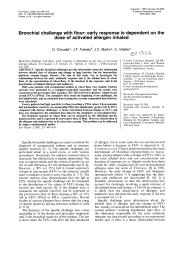 Cet article concerne une étude réalisée dans le but de proposer une méthode d'analyse des relations dose-réponse obtenues lors des tests avec générateur d'aérosol de farine, en se servant du test au lactose comme référence et en mesurant la réactivité bronchique. Elle a été effectuée sur 38 sujets asthmatiques exposés professionnellement à la farine, pour lesquels un test au lactose puis à la farine de blé ont été effectués. Les résultats ont montré l'utilité du calcul PDf20 (dose de farine provoquant une chute de 20 % du VEMS - volume expiratoire maximum par seconde) pour mesurer le degré de réactivité bronchique spécifique ; celui-ci est malheureusement irréalisable en cas de variation modérée de la fonction respiratoire. La comparaison de la variation du VEMS lors du test à la farine avec les résultats du test au lactose a par ailleurs permis de discriminer les sujets ayant une réactivité bronchique spécifique intermédiaire mais significative. Ces résultats confirment le rôle de la dose inhalée d'allergènes et font évoquer celui du débit de dose dans le déclenchement des crises d'asthme.