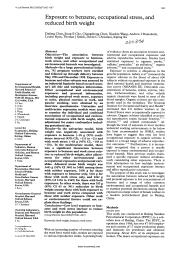 Les conséquences de l'exposition maternelle à des solvants organiques sur le poids de naissance du bébé ont déjà été étudiées dans différentes professions (coiffeuses, laborantines, personnel des teintureries et des blanchisseries), mais l'influence de l'exposition paternelle n'est pas encore élucidée. L'étude épidémiologique présentée dans cet article a été menée dans le secteur de la pétrochimie afin de rechercher l'association entre l'exposition maternelle et le poids de naissance, d'une part, et, d'autre part, l'association entre l'exposition paternelle et ce poids de naissance. Les sujets inclus dans l'étude étaient des couples travaillant dans la même entreprise et ayant eu des enfants entre 1996 et 1998. Les résultats obtenus par interviews des parents étaient les suivants : l'exposition maternelle à des solvants était associée à un faible poids de naissance ; un grand nombre de bébés de faible poids était de sexe féminin et provenait de mères jeunes. Pas d'association significative n'a été trouvée concernant l'exposition paternelle. Ainsi, l'exposition maternelle aux solvants aurait une plus grande influence sur le poids de naissance des bébés que l'exposition paternelle.