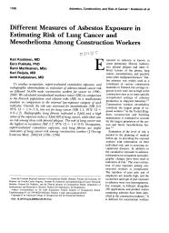 Le risque de cancer a été évalué pour les travailleurs de la production d'amiante et autres travailleurs massivement exposés dans de nombreuses études. Cependant, la masse des résultats épidémiologiques sur l'amiante vient des expositions intermittentes dans le passé lors de l'utilisation de produits de l'amiante. Cette étude s'est axée sur l'estimation du risque de cancer dans ce type de population. 23 285 hommes et 930 femmes participant à une campagne de surveillance nationale des maladies bénignes liées à l'amiante en 1990-1992 ont été suivis par l'intermédiaire du registre finlandais des cancers jusqu'en 1998. Les taux d'incidence standardisés (SIR) ont été calculés par rapport à la population générale. En conclusion, les résultats ont montré que dans une population de travailleurs du bâtiment de longue durée, les risques de cancer du poumon et de mésothéliome étaient augmentés, mais beaucoup moins que chez les travailleurs de l'isolation, les floqueurs d'amiante, ou les patientsatteints d'asbestose. Etant donné qu'il n'était pas possible de suivre la plupart des sujets sollicités mais non participants à la surveillance initiale, des biais de sélection, dus au tabagisme ou à d'autres facteurs du mode de vie ayant pu être des éléments individuels de la décision de ne pas participer à une surveillance de la santé, ne peuvent pas être éliminés.