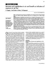 (Benzène et naphtalène aériens et dans l'air expiré comme indicateurs de l'exposition aux carburéacteurs).