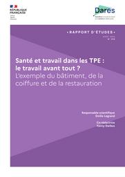 L'enquête SANTPE, menée dans le cadre d’un appel à projet lancé par l'Institut pour la recherche en santé publique (IReSP) et ses partenaires (dont la Dares), a pour objectif de comprendre comment les dirigeants et salariés de TPE de la coiffure, de la restauration et du bâtiment articulent les enjeux de santé et de travail, pour les concilier au mieux et simultanément et le cas échéant repérer les arbitrages opérés entre les deux. Plus en détail, les résultats de cette étude montrent que dans les entreprises de moins de 10 salariés de ces trois secteurs d’activité les employés font largement corps avec les enjeux économiques et organisationnels du travail ; cette endurance les conduit à mettre en place des stratégies de contournement des troubles de santé et d’évitement des institutions médicales, d’où vient également l’invisibilité d’une large partie des accidents de travail des salariés de TPE. Les principales pistes de prévention développées dans ce rapport suggèrent de renforcer le rôle des médecins du travail et des conseillers de prévention CARSAT, de former et s’appuyer sur les acteurs intermédiaires, d’apporter un soutien financier et un accompagnement des dirigeants de TPE pour l’achat de matériel et proposer de formations visant à améliorer la sécurité des personnels, ainsi que de valoriser les outils institutionnels déjà existants comme ceux conçus et diffusés par l’INRS (ex : OiRA, MAVImplant, TutoPrév', Agir suite à un accident du travail).