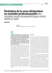 Le taux de sous-déclaration des troubles musculo-squelettiques (TMS) en maladies professionnelles (MP) correspond à la part des TMS qui n'ont pas fait l'objet d'une déclaration en MP parmi l'ensemble des TMS d'origine professionnelle touchant des salariés et correspondant à un tableau de MP. En 2016-2017 et 2018-2019, le taux de sous-déclaration se situait entre 50 et 75 % pour l'ensemble des TMS considérés (épaule, coude, rachis lombaire, syndrome du canal carpien (SCC)), quel que soit le sexe des salariés. Malgré une baisse ponctuelle en 2013, la sous-déclaration des TMS de l'épaule restait plutôt stable entre 2009 et 2016-2017, entre 59 et 65 %, avant de connaître une hausse à 72 % en 2018-2019. Cette hausse sur la fin de période est d'autant plus marquée chez les femmes. La sous-déclaration des SCC était relativement stable entre 2009 et 2019 (entre 55 et 60 %), à l'exception d'une nette diminution en 2015 (43 %). La sous-déclaration des TMS du coude et du rachis lombaire restait relativement stable sur l'ensemble de la période 2009-2019, entre 60 et 70 % pour le coude, et 50 et 60 % pour le rachis lombaire. Les principales raisons de la sous-déclaration étaient la méconnaissance du salarié quant à la démarche, un bilan diagnostique insuffisant, et le refus du salarié ; ce refus étant dû dans la majorité des cas à une crainte pour l'emploi. La sous-déclaration des TMS, bien que difficile à évaluer, reste donc un phénomène considérable, ce qui souligne l'intérêt de continuer d'améliorer la bonne information sur les accidents du travail-maladies professionnelles (AT-MP) des travailleurs, des employeurs et des médecins. Par ailleurs, ces résultats ont alimenté en 2024 les travaux de la Commission instituée par l'article L.176-2 du Code de la Sécurité sociale chargée notamment d'estimer le coût des maladies professionnelles non déclarées.